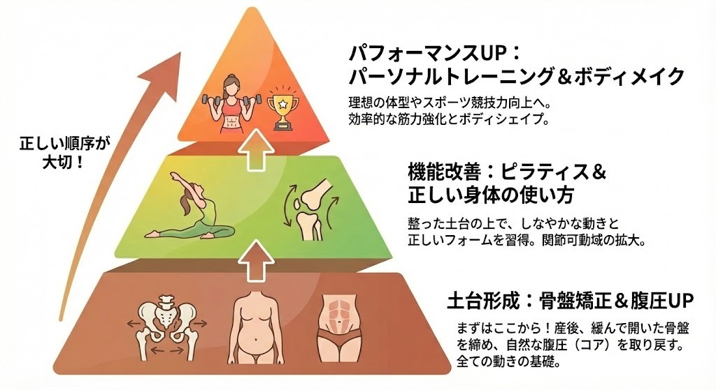 産後の骨盤矯正は、ただ締めるだけでは足りません。当院では「3ステップ」のピラミッド理論に基づき